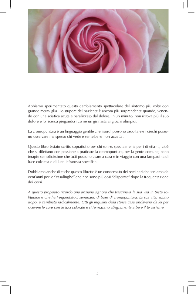 Questo libro ci porta a una visione "altra" della sofferenza del corpo e dell'anima che vi abita. La luce che fa comunicare le cellule del nostro corpo tra di loro, fa dialogare il dolore fisico con le radici interiori e profonde dentro di noi che l'hanno originato ed espresso.